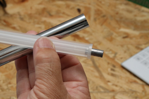 シャフト内のチップ、バット部分にウェートを入れ、バランス調整します、チップ部分の場合はヘッド抜いて、ウェート入れ、バット部分はグリップを抜いて、重り入れます。(グリップの再利用が基本ですが、グリップが劣化してる場合は再利用ができません)