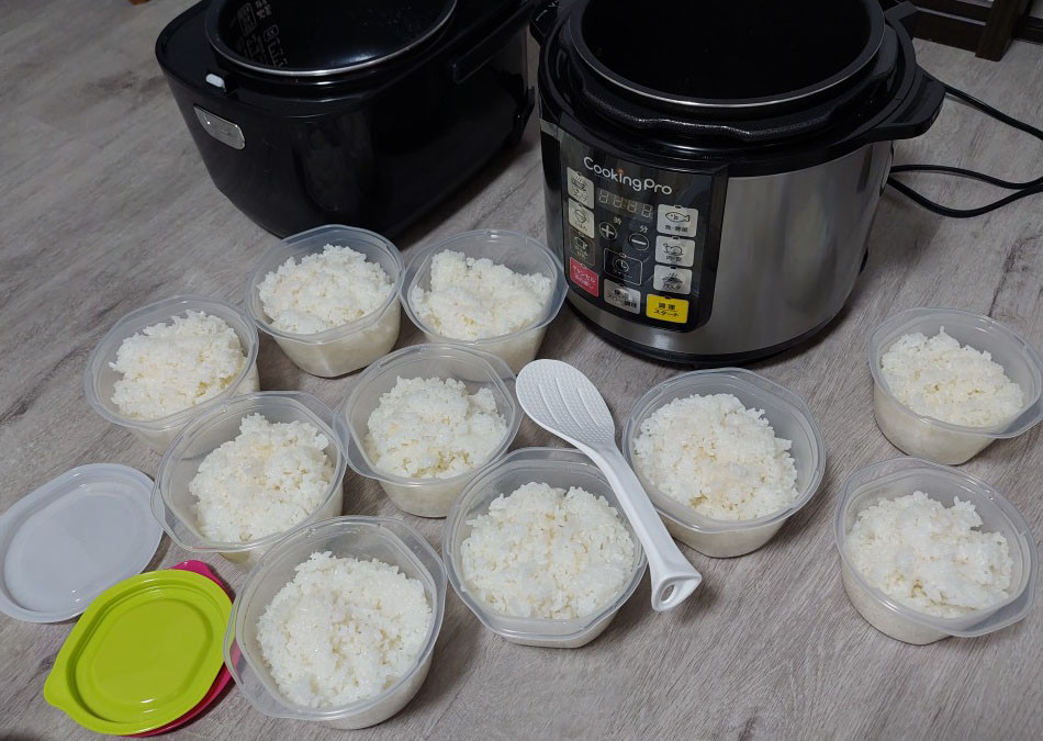 毎回、10合ずつ、ご飯を炊いてますが。前回までは炊いたご飯をすべて、ラップに包んでました。移す作業が、熱いし、量がまちまちで、と思ってました。自分と同じ独身の友達が、「自分は小分け用に、電子レンジでチン出来る容器一杯買ってに入れてるよ!」。食べる量が揃う、ご飯を移す作業が、ラップがくっついて、やり直し、熱くなくて、早い。レンジに入れて温めても取り出すのが簡単そう。ちょっと、ラップよりかさばるけど。冷凍庫に入れて終了です。毎回、10合炊いてますが、炊き立てご飯が美味しいので、茶碗2杯(一合)ぐらい軽く、食べちゃうので、冷凍庫に入れてるのは、8合???