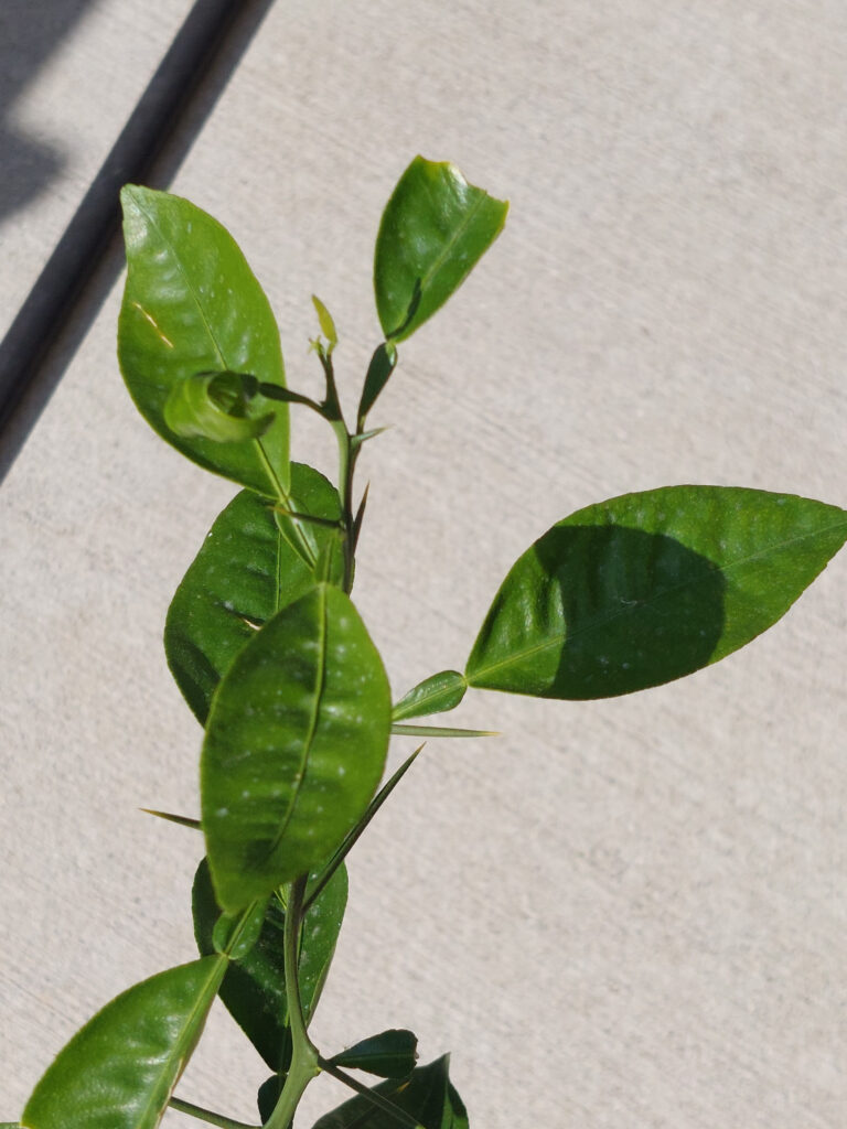 自分もいろんな意味で成長したいと意味も込めて、オレンジの種から苗木にやっと育ってきました。前回は、葉っぱがカジカジされて、犯人は、小さなバッタで自分の体重以上に食べる大食漢でした。殺しはせず、苗木の方から追い払いましたが。また、誰かが、上の方の葉っぱをカジカジしてます。老眼鏡かけ、目を凝らしてみても、犯人は見つからず、現行犯を発見できません。4本の苗木の一番大きな苗木、上の割と新しめの葉っぱを集中的に狙われています。何とか、食い止めなければ。やばいです。何年でオレンジがなるのかな???と楽しみにしてるだけに。