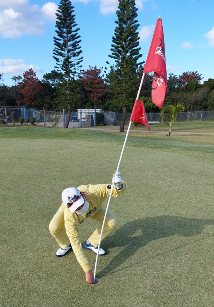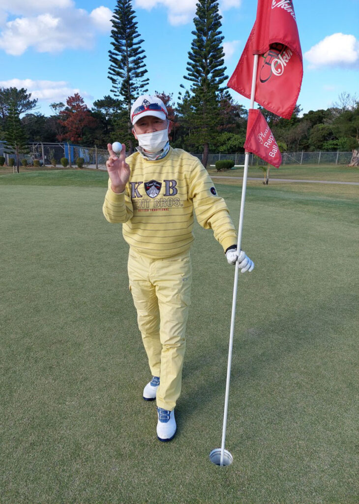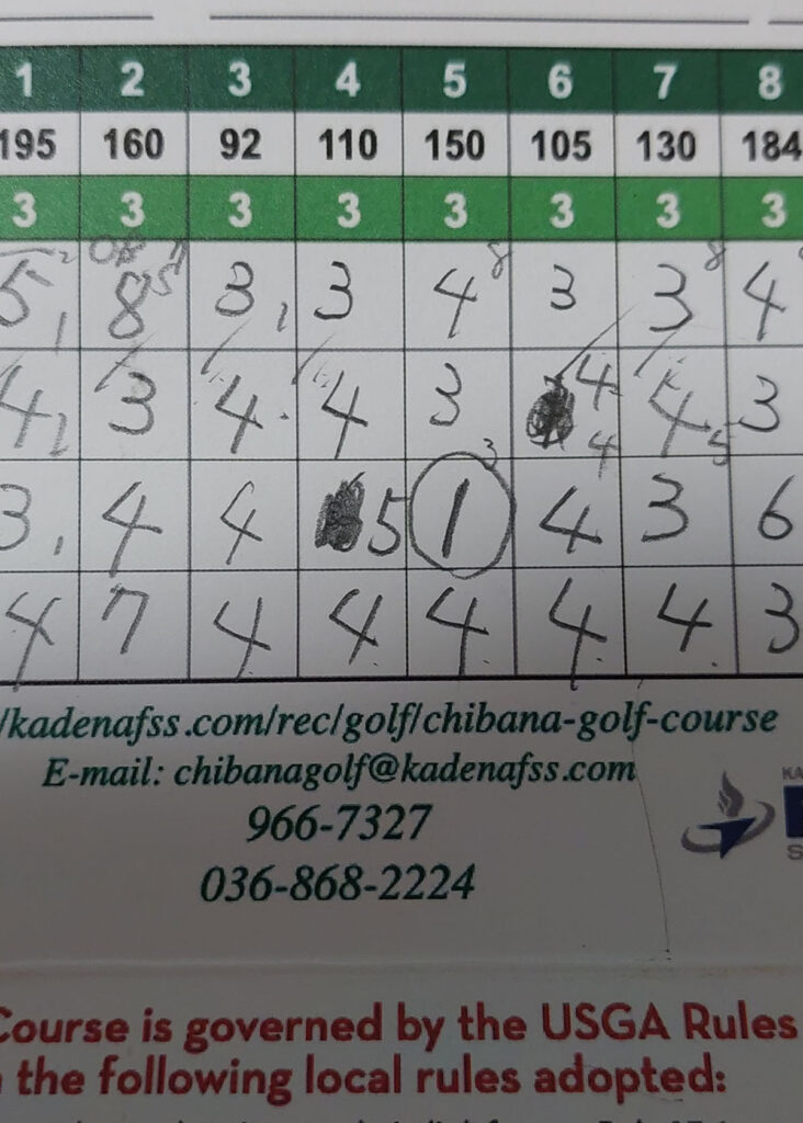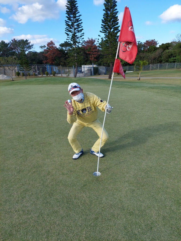 4回目のホールイワン出てから、16年ぶりに5度目のホールインワンが出ました。米軍基地の中にある、知花ゴルフコースの5番ホール、打ち上げの158ヤード。風は少々揚げでユーティリティ5番で打ちました。健人くんとラウンドで、後ろの組の3人も見てる中。会心のショットはグリーンにオンしピンに向かって行き、打ちあげなんで、見えませんが、松山ばりのゴー!じゃないですが「入れー!」と叫んでいました。