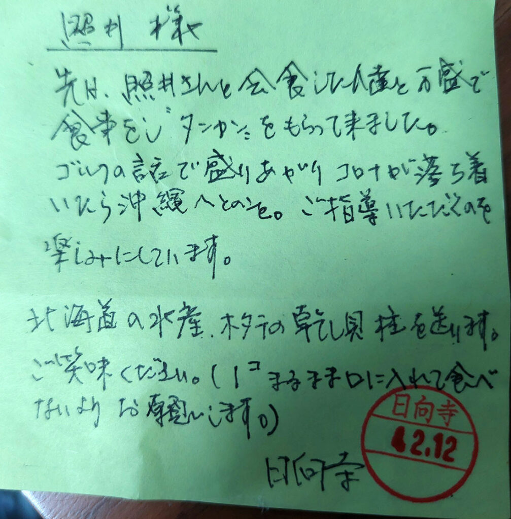 PS.ご賞味くださいと、メモの中に、一個そのまま、口に入れないようにと・・・。当然、道産子だった、自分は知ってますが、元々乾燥させて、かなり大きなものが小さくなってます、一個まるまま、口に、放り込むと、水分を吸って、口の中で膨らみすぎて大変なことに・・・、酒のつまみなんで、ちょっとちょっといただきます。貝柱を一杯いただいたので、沖縄のゴルフ友達にも味わってもらいます、日向寺さんありがとうございました、コロナが落ち着いたら、沖縄のゴルフでお待ちしてます。