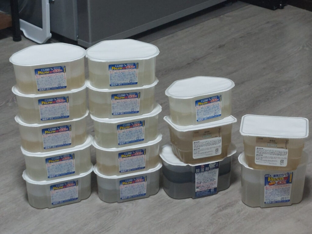 PS.昨日、大量に買ってきた、除湿剤を交換しました、15個、の満タンの除湿剤が出てきました、これだけでも、5リッターぐらいあるんじゃないかな???