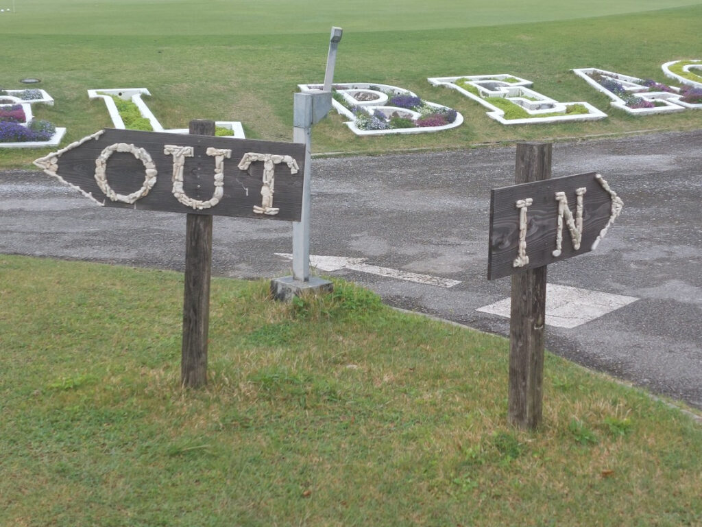 PS.ベルビーチは何回も、来ているコースですが、はじめて気がつきました。アウト、インの看板です。よくみると、珊瑚で出来てました。ビックリ!!!!