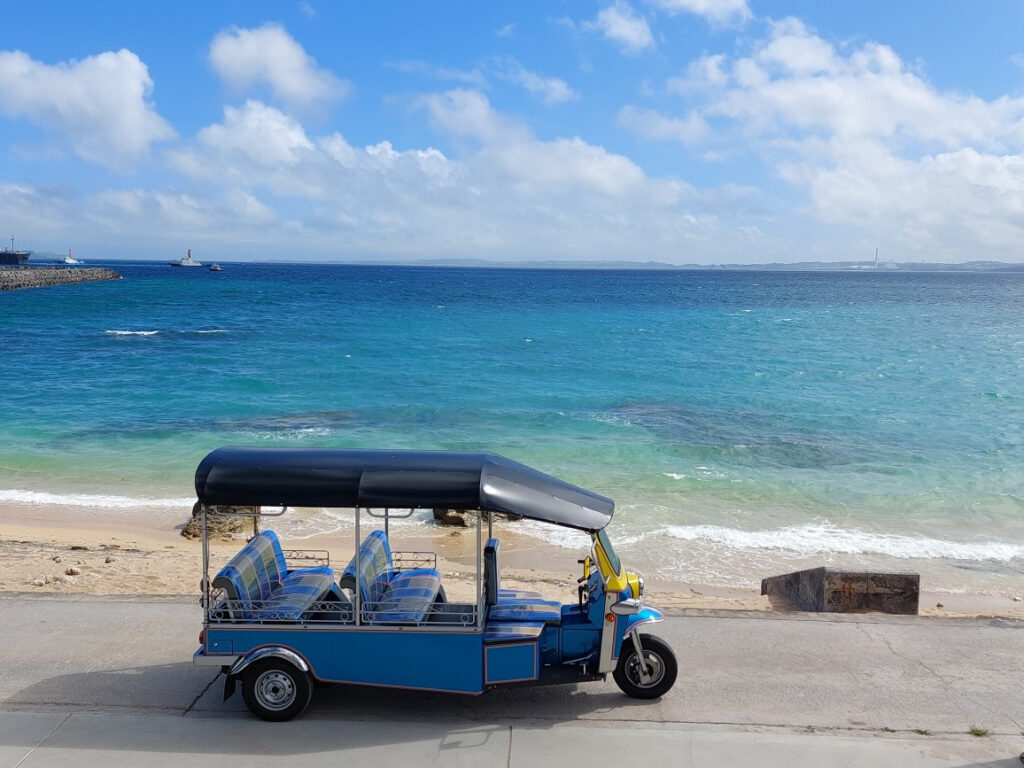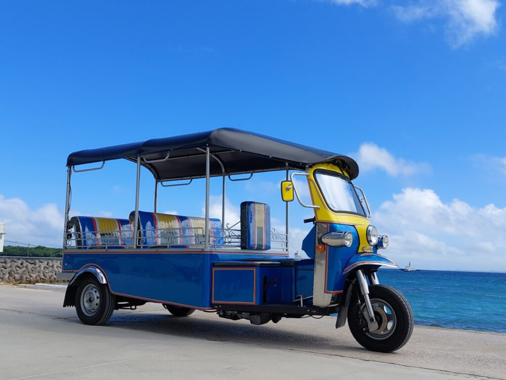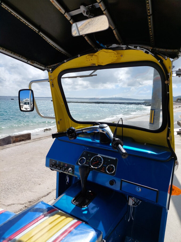 トゥクトゥク???を運転してきました!!!自分のゴルフ友達が海沿いに来月、お店をオープン、そのイベントでトゥクトゥク???で金武の繫華街から、海沿いのお店まで、送迎のするみたいです。運転しても、後ろに乗っても天気が良くて、風も入ってくるので、中々快適です、青空にトゥクトゥクは似合います!!!