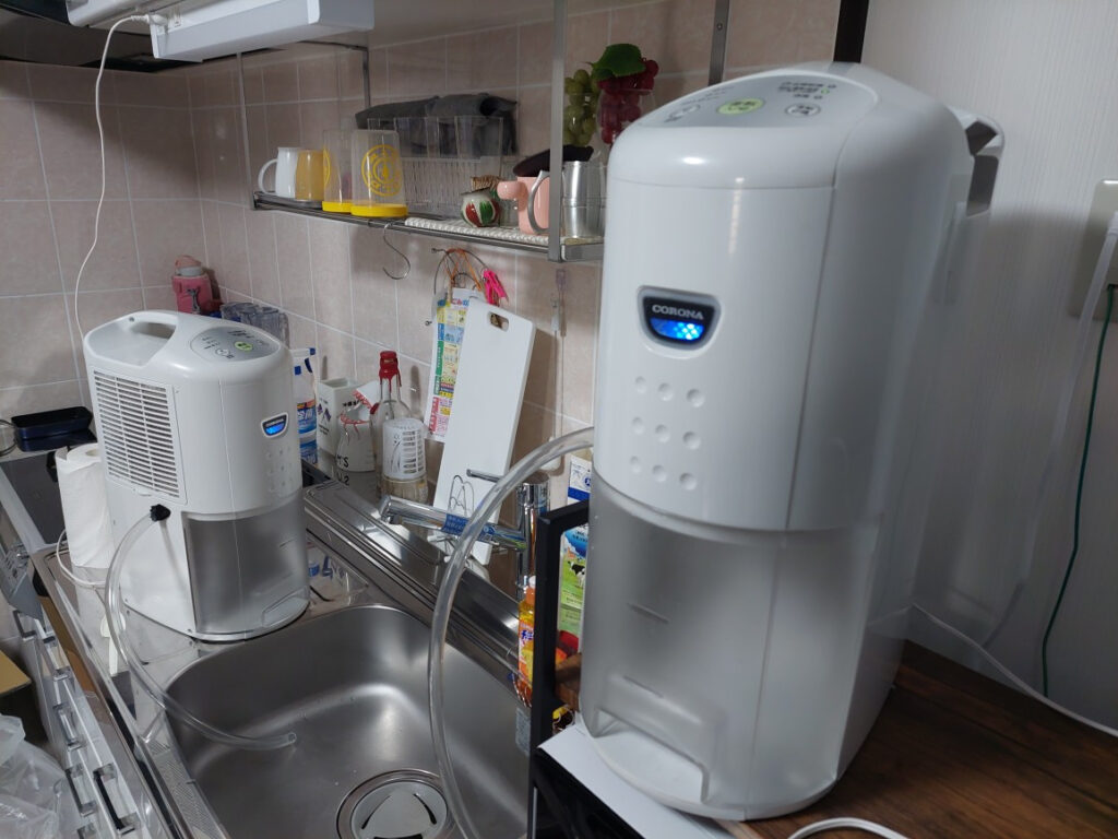 北海道に帰るときは、いつもいつも、デージー大変です!!!!まず、寝室と工房にある、除湿器2台を流しの所に持って行って、チューブをつないで貯まった水が流れるように2台セット。この時期は、湿気がすごいので、毎日、各3回ぐらい除湿器に貯まった水を投げます(北海道弁で捨てる)一日20リッターぐらい???。なので、除湿器を回してないと、どんだけーーーー!!!水分??水が溜まるのでしょう???今回の北海道で300リッターぐらいかな???