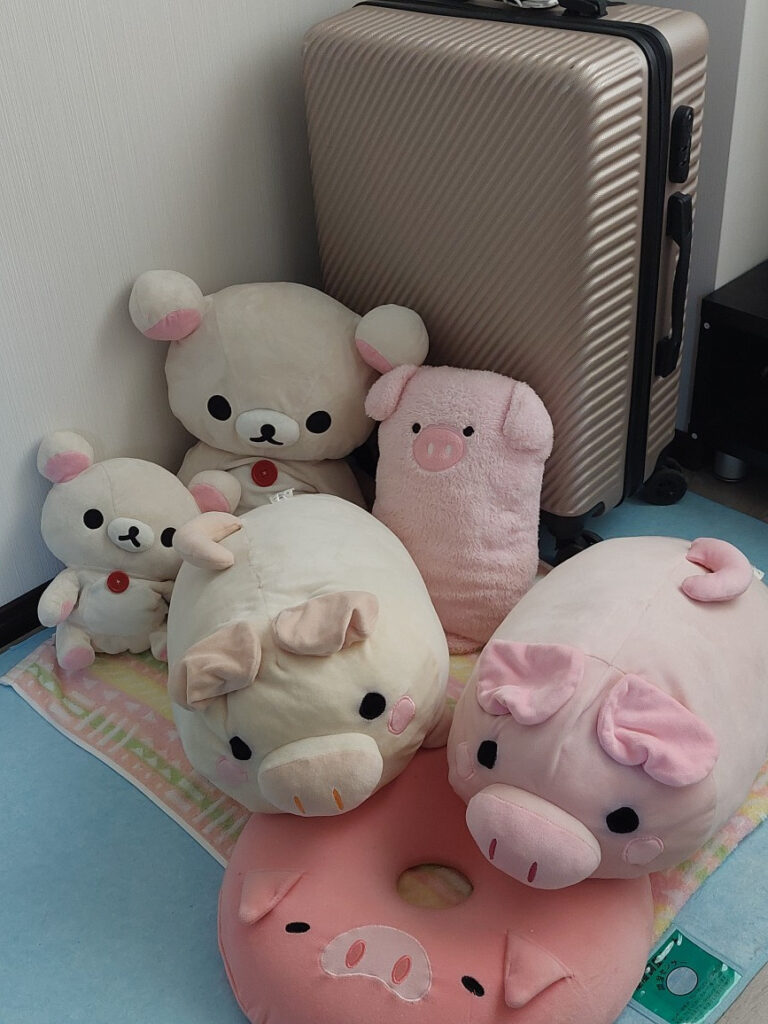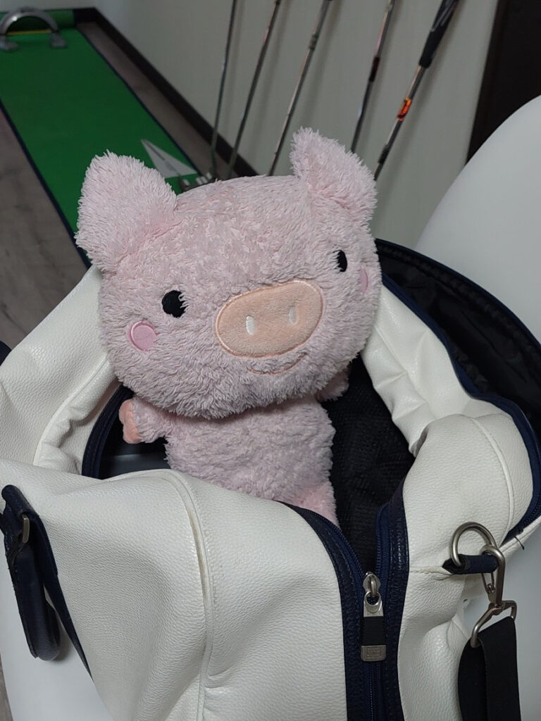 いつも旅行の時には一緒に出掛けるピーちゃん(ピンクのブタのぬいぐるみ)と筆ピー(後輩のチエにもらった、筆入れ型のブタさん)パソコンと各種充電器、後は各種の痛みに効く最強の張り薬のロコアテープ(13日連続でゴルフをするので・・・)と糖尿病と高血圧の薬を持って終了。