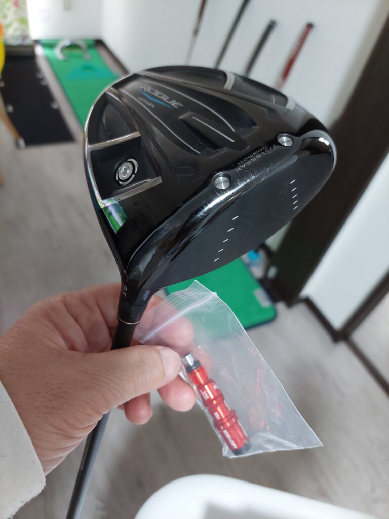 今回の注文は、キャロウェーローグのドライバー(スリーブ無し)から、ツアーADのシャフトを抜いて、そのシャフトにテーラーメードのスリーブをつける。超ーーー極太(直径2.8センチでノーマルが1.7センチ)のジャンボグリップが後つけでついていて、バランスはC8.5と軽かったですが、スリーブが約6グラムで重さがあるので、D2.5(一般的などドライバーのバランス?)ぐらいになりました・・・。これで、振りやすくなってればいいのですが・・・