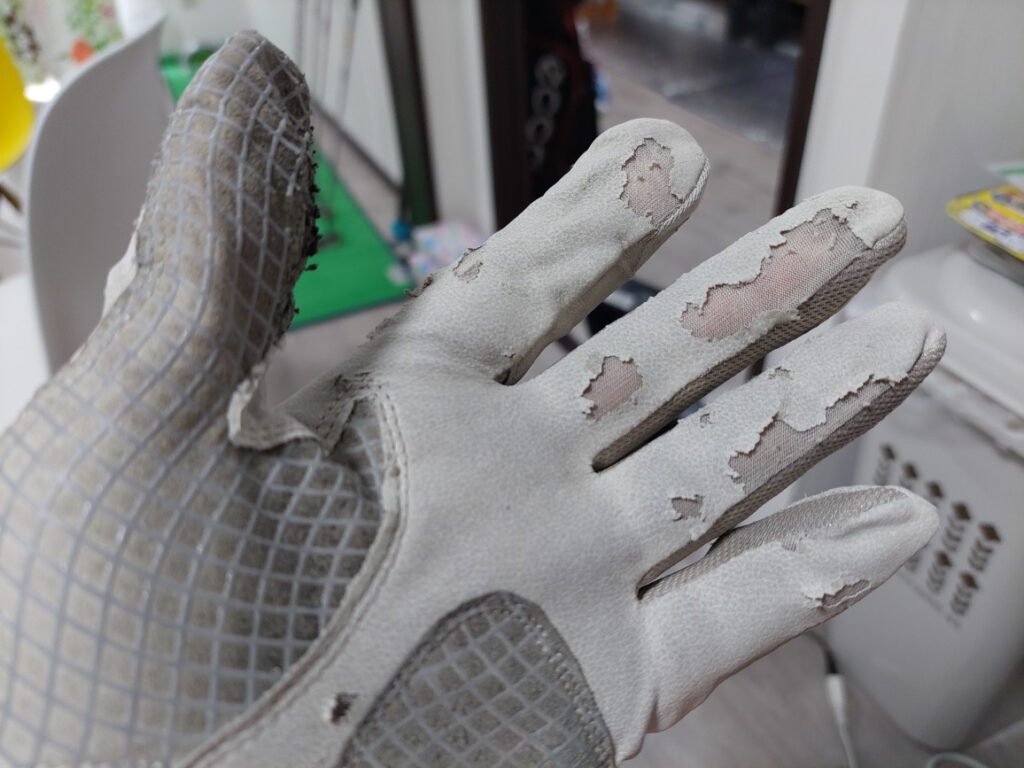 なので偶然、合うのを見つけると最低でも10足以上は買います、ラウンド数も多いので・・・。今、使ってるアディダスのグローブも、沖縄の浦添のお店で偶然、見つけてそこに、自分に合ったのがあって、そのサイズを全て買いました(多分10以上)はずなのに・・・もう、1年!!4足しか残って無くて全てボロボロです・・・。流石に、また探して買わなくては・・・。