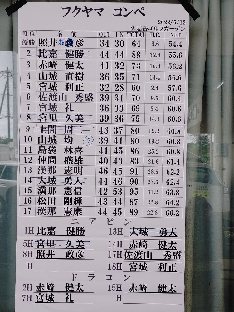 福山地区の、コンペに行ってきました。今季5勝目です!!! 2022/06/12 ゴルフ 2022-06-12 19:02:00 福山地区の、コンペに行ってきました。一緒に回った、宮城さん(ちなみに、ベスグロです。)が、とても、上手い方で、リズムよく、ラウンドが出来ました。OBも2つ、シャンクも2回でましたが、バーディーを3、ダボの3ヵ所がダブルぺリアが、ハマって今季5勝目です!パチパチ!!! PS.キティちゃん、女の子にいつ会えるかな???今日から、代行バイト時は、いつも持って歩きます・・・!!!
