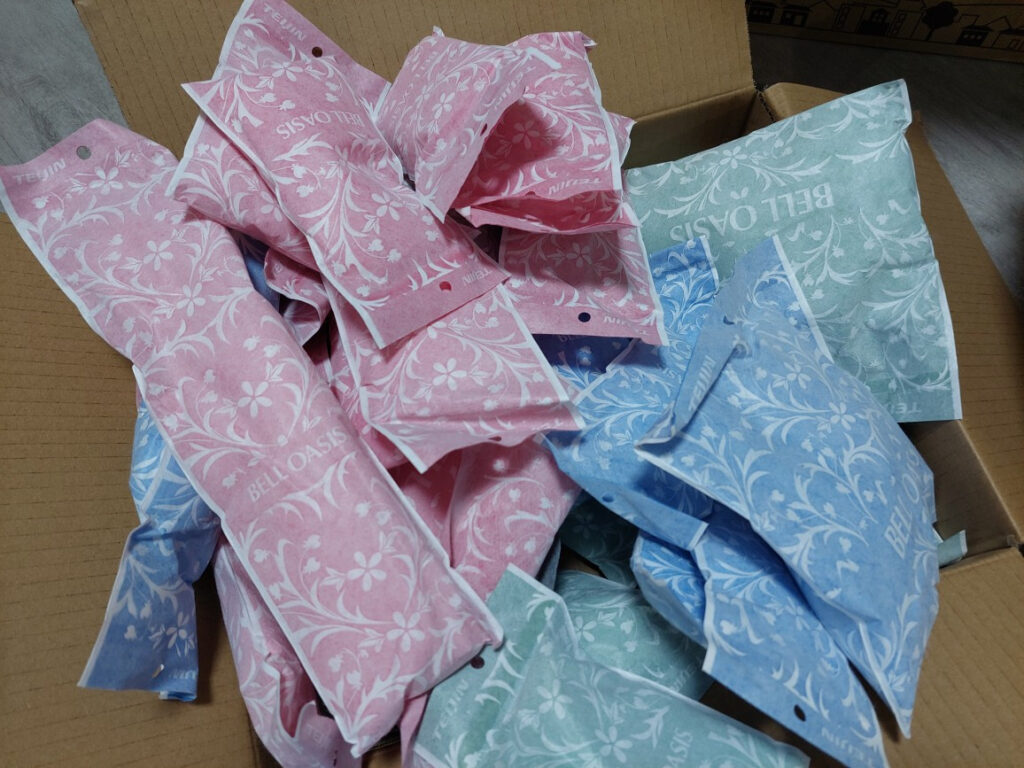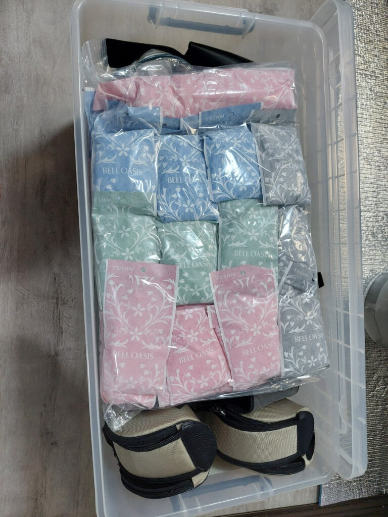 TEIJINのベルオアシスが届きました!!!湿気対策の救世主にならないかな????42個セットを二つ(合計84個)頼みましたが・・・物がやっと届きましたーーーー!!!!感想は、えーーーレギュラーサイズが小さい???これで、大丈夫???イメージ的には、レギュラー(10㎝×18cm)は靴の入れるぐらい???とりあえず、洋服ダンスの引き出しに2個づつ、流しの引き出しに2個づつ入れ、大(22cm×22cm)とスティックタイプ(10㎝×35㎝)をクロゼットに入れました、その際に、2週間前ぐらいに入れた、除湿剤は全て満タンです・・・。