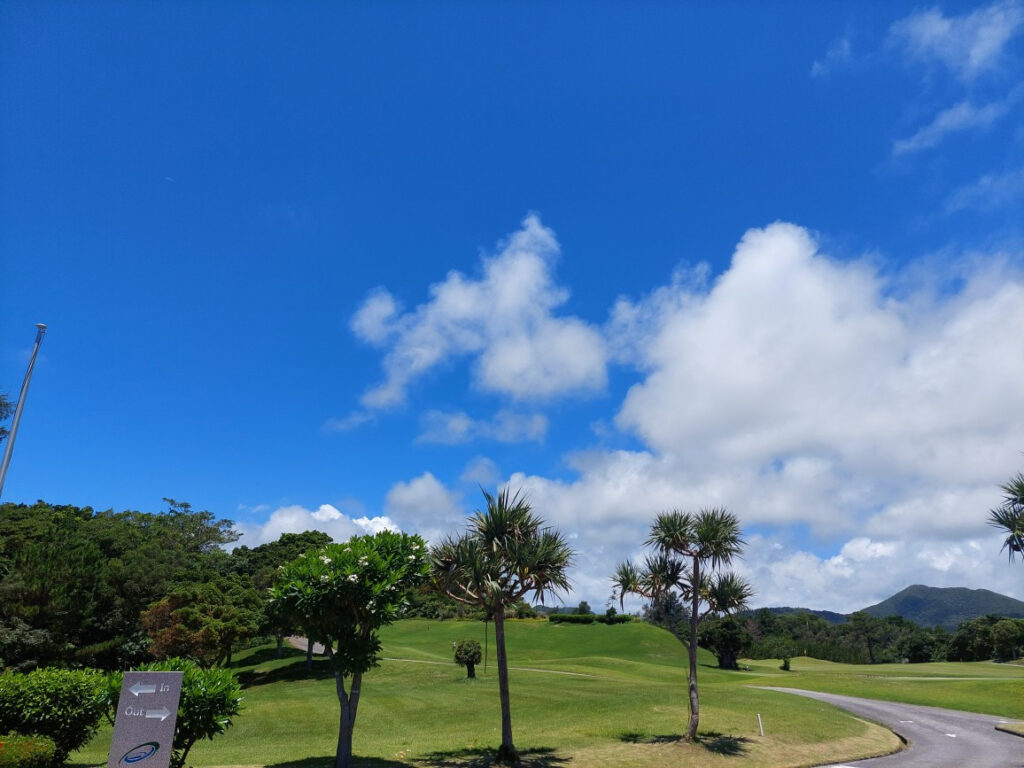 天気は良すぎでした!!!!もう、完全に、ま夏です!!黒いパンツ失敗!!!30℃、越えの好天の中、苦手のアウトスタート、宜野座村の大会でOB2連発で11打叩いたホールです。くじでオナーになり、一打目はど真ん中に、先に打った人が、左手前のバンカーに入れて嫌だなーと思ったら自分も同じフェアウェーバンカーに!!!。で、残り110ヤード、あごが高いのでサンドで一回出せば良いモノの、ピッチングあごに、やっぱりあたって、またバンカー、今度はサンドで出して、5オン2パットのトリプルスタートです、前半はパーオンも3パット2回で45でターン。
