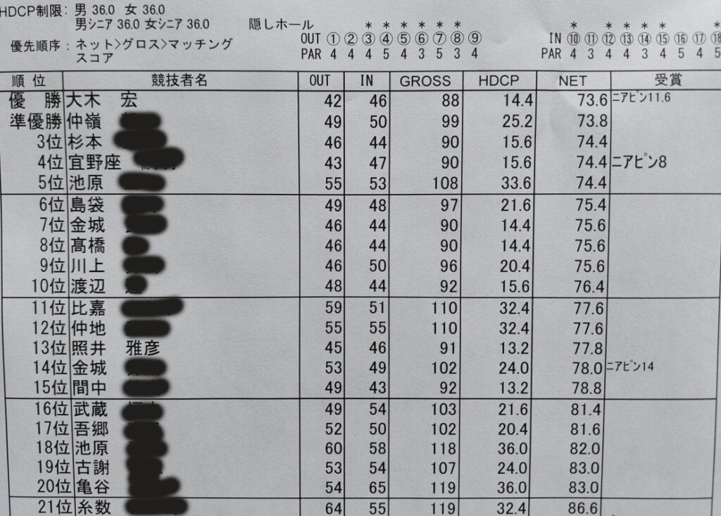 後半もバーディーチャンスを決めれず、次のホールで初OBを出すと、ガタガタと崩れ、シャンクは出るは!!!で、46叩いて、91でした。ベスグロは88、2番目のスコアーが90で、自分91も、トリプルの所の3個が一つもハマらず13位と撃沈!1メートルちょっとにつけたニアピンも、北海道から沖縄に移住したゴルフ友達のヒロピーに抜かれました、もう、1つ取ってるのだから、俺の取らないでよー!!!