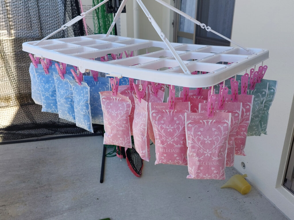 PS.湿気取りの救世主???を購入して、ベルオアシスを色々な所に、除湿のために配置しましたが・・・沖縄の異常な湿気には結構厳しいのか???一番小さな11グラムの物がすぐに、16グラムになったので、2カ月に一回の天日干しのサイクルが、かなり、湿気を吸ったので、1週間ちょっとで、一番小さなもの、36個を外のベランダに出して、天日干ししてます!!!。湿気取りになるかと思いましたが・・・エコなのかもしれませんが、結構メンテナンス???天日干しの作業が大変かも???