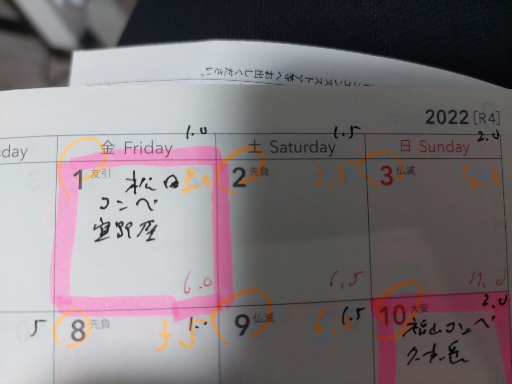 ちなみに、スケジュール帳を見ると、ちゃんと、重要事項ピンク枠で、松田コンペ、宜野座ゴルフとなっていて、自分も、宜野座地区の唯一参加してない、コンペに参加できると楽しみにしてたのに・・・何やってんだよーーーー!!!!!アーーー情けない!!!弟にゴルフでミスした時ではないが・・・・モ~モ~モ~で、牛さんみたく叫んで、大牧場状態です・・・