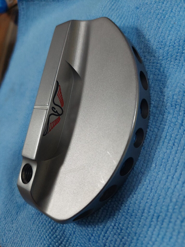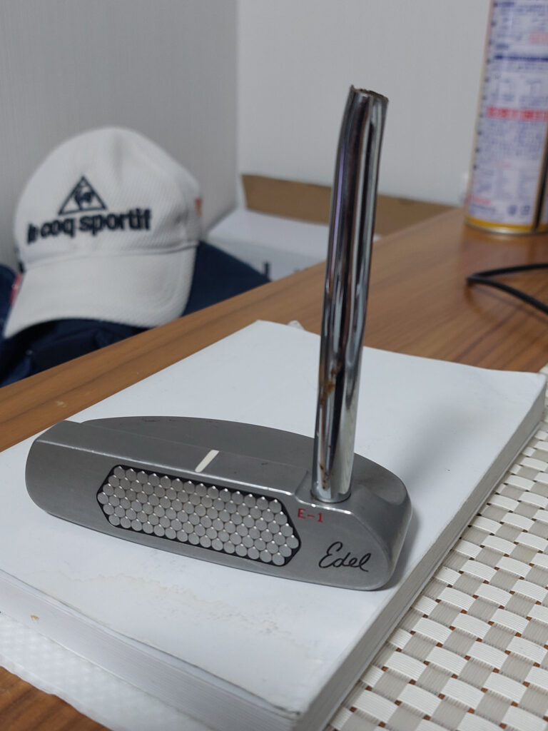 超ーーー!!!個性的な革新的なイーデルパターの折れたシャフトを抜きました!!!イーデルパター、理論をもとに、デザインも超ーーーカッコいいパターです!!!フェースバランスは、普通のパターよりかなりきいてます。それを実現するために、軽くするために、後ろの部分に、穴をあけた所や、パターの下の部分を削ってあります!!!上から見るとオーソドックスなスッキリしたマレット型で自分も好きな形です!!!とても、良いクラブなのですが・・・自分には高額なパターなので、ちょっと、買えません。