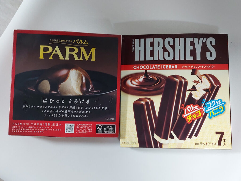 最近はピノアイスだと食べ過ぎるので、アイスバーにしてます!!!(それでも、糖尿なのに・・・食べ過ぎますが・・・)いつもの、パリパリバー(アイスにチョコレート練りこんでいるバー)が残念ながら、売って無く、パルムと初めて見る、ハーシーチョコレートアイスバーを買って、早速食べ比べて、みました!!!パルムの圧勝です(一本ずつのつもりが・・・パルムはお代わり???してしまいました・・・)!!!