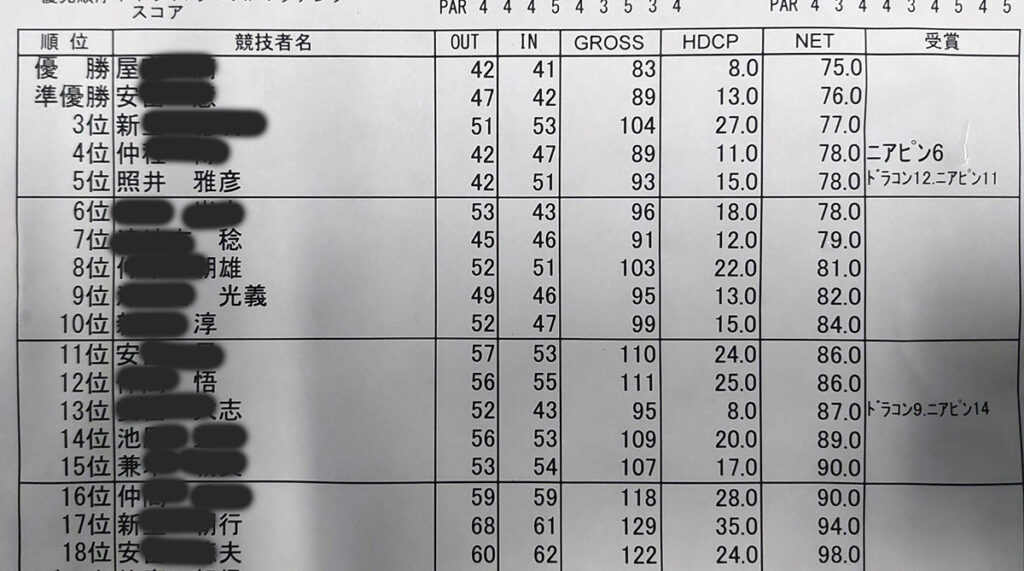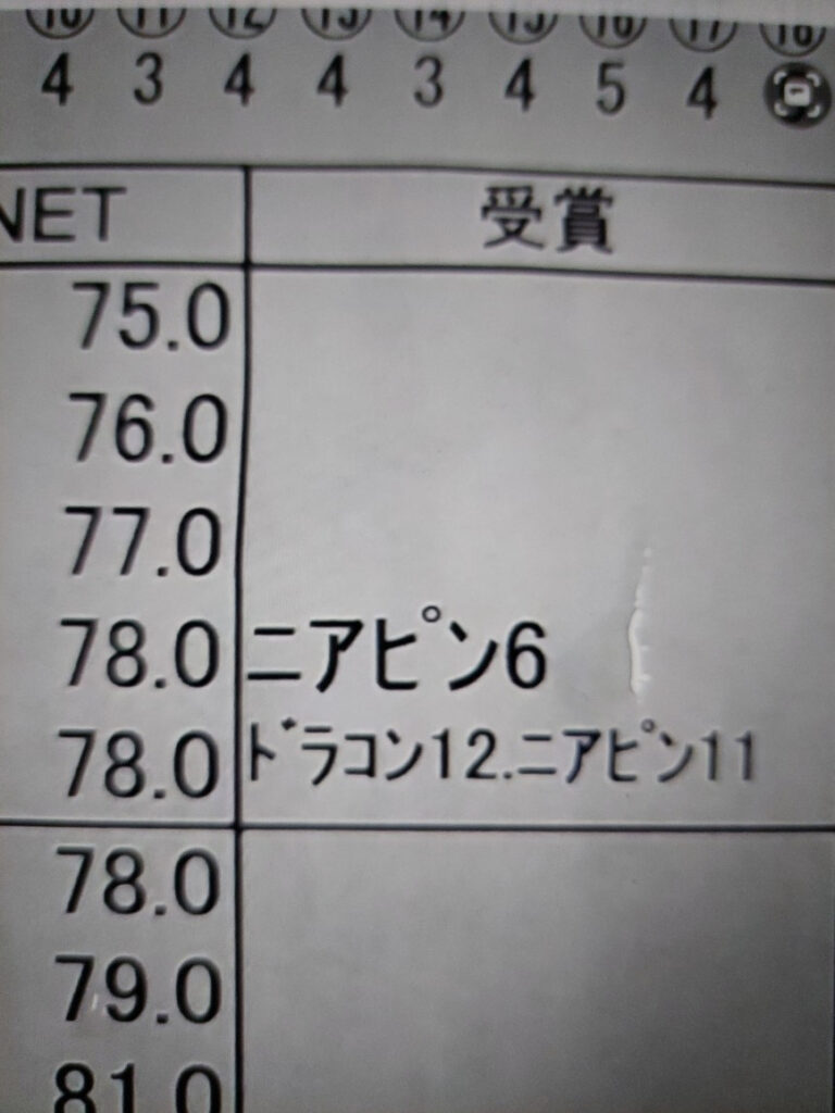 その後もボギーパーで17番まで頑張って13オーバーで、最終18ロングホールでトリプルを叩いてもハンデ戦なので優勝です。1打目、スライスして、バンカーの手前と思って、ウッドしか持って行かず、フェアウェイバンカーに入っていて、顎が高く9番アイアンぐらいでしかでないのに、横着して顎に跳ねてOB。