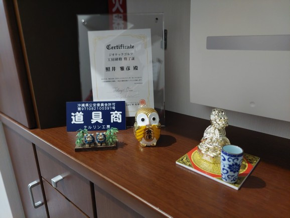 テルリン工房の奥に在った、金色のフクロウ君を玄関に移動しました!!!工房の、奥に鎮座していた、金色の金運???のフクロウを玄関の横の棚に移動。棚には初めは、何も置いてませんでしたが・・・どんどこ増えて、ジオッテクゴルフの工房研修終了証、(これも前は、工房の奥のフクロウの横に)沖縄県公安委員会の道具商の許可書(これは、工房をする上で必要で許可書を取って、目立つ場所においてくださいで・・・玄関に!!!)