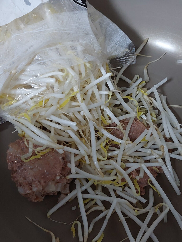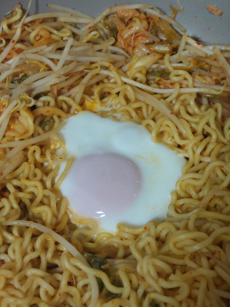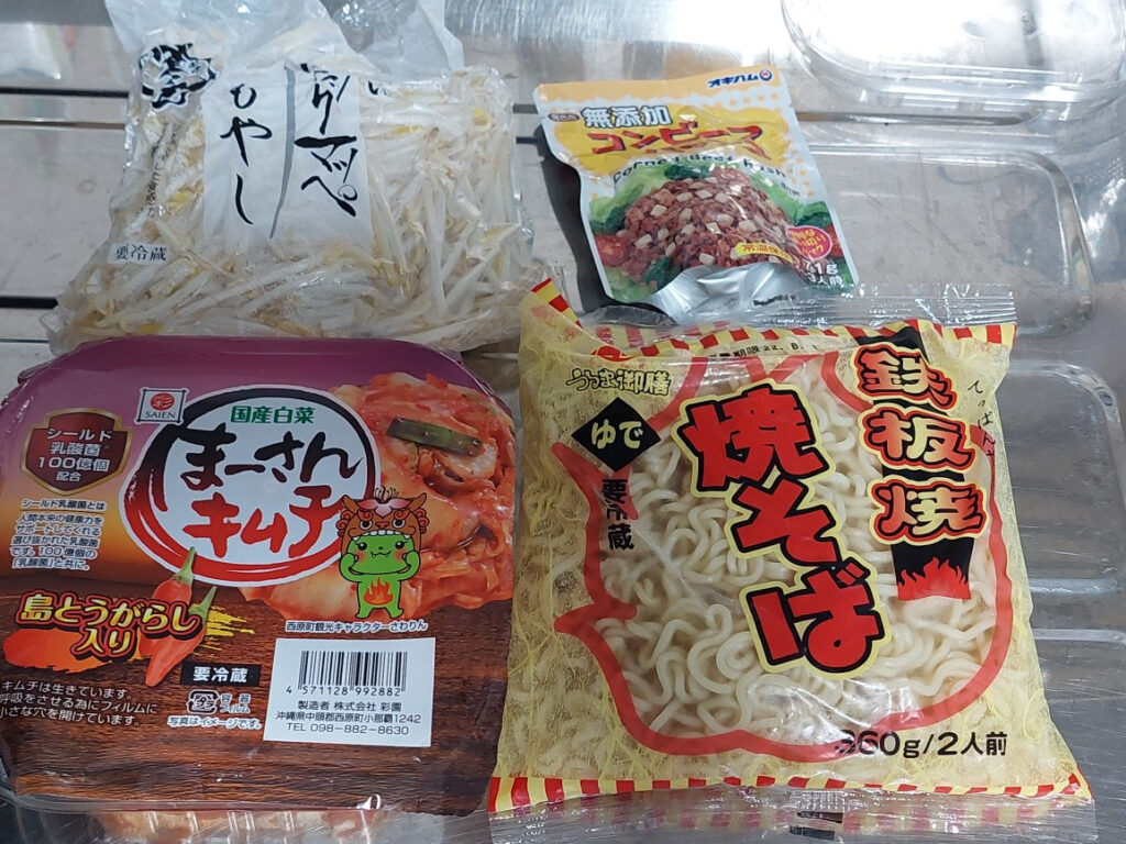 チャチャと、時短?完成まで、5分ぐらい???キムチ焼きそば!沖縄では、自分が一番、美味しいと思ってる、彩園の、まーさんキムチと、コンビーフハッシュと、もやし、最後に玉子を落として、ガラス蓋を閉めて蒸らして、完成!(蒸らす、時間も入れると7分かな?)!PS.塩をちょっと足すだけで、キムチが元々、美味しいので、デージーまーさんです!ちなみに、もやしが、北海道と違います!沖縄のもやしは、スリム?細いです。北海道でも、ジンギスカンなどに、良く、もやしを使いますが、もっとデブです。