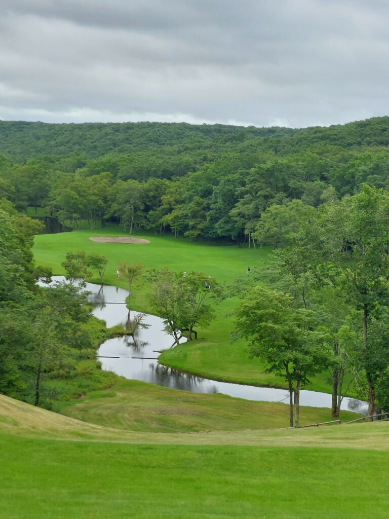 後半は、超ートリッキーで「ピリカの誘惑」と名前がついた、ロングホールにやられました。ティーショット、池越え、左ドッグレッグ、2打目も池越え、で、ティーショットが右だと、2打目、が池を越えないので、手前にレイアップ、本来は3打目が4打目も、グリーンに向かっても、池越えで、昨日夜半の大雨で、地面が踏み込むと、沈みこんで、ダフってしまい痛恨の池ポチャでトリプルなど、色々やっちまって、46でトータル、86。