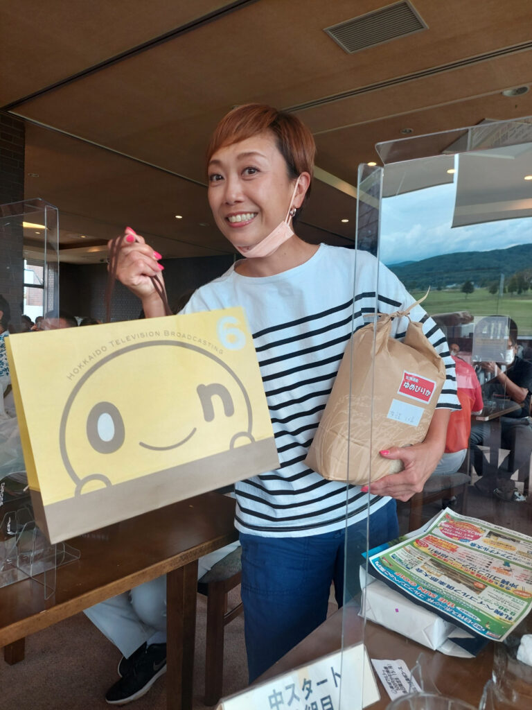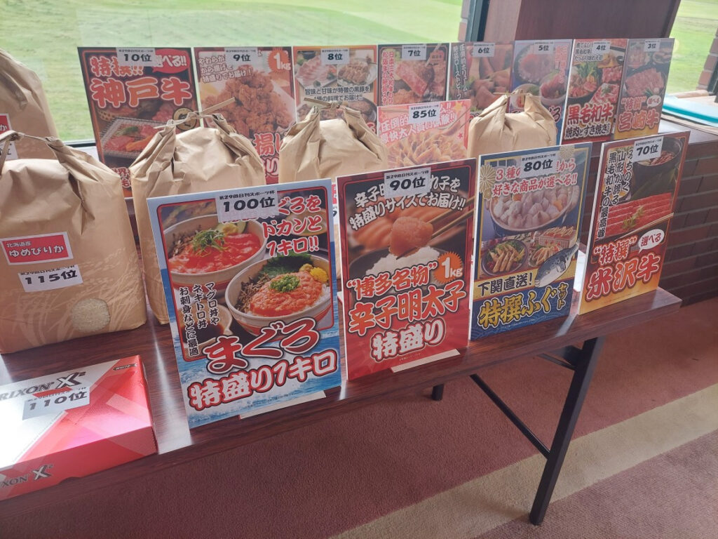 後、150人の参加者がいるので、自分たちは11人で参加してるで何かみんなに当たらないかな????と思ってましたが、賞は、同じ組で回った野村育美さんが82で女子の部で優勝です!パチパチ!!弟が60位で、米沢牛のコロッケがあたりました。自分は51位ではまらず、150位で101です!レべル高すぎ!!!