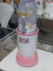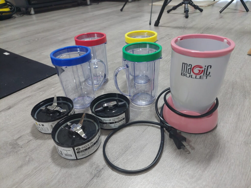 で・・・当時、テレビショッピングで、ジューサーのマジックブレッド紹介していて、いつもの「ポチっと」癖でポッチとして、マジックブレット買いました!!!で・・・やはり、自分は持ってる???人なんで・・・その後、ゴルフコンペで、また、マジックブレットが賞品当たり!!!札幌の家に2セットありました!!!よくあるある???ですが・・・初めは、珍しくて・・・ちょっと、使いましたが後は、2セットをケースに入れて、そのまま・・・当然、取扱説明書&レシピ本もあります!!!。で・・・???2セットの中から適当に見繕って、持って帰ってきました。