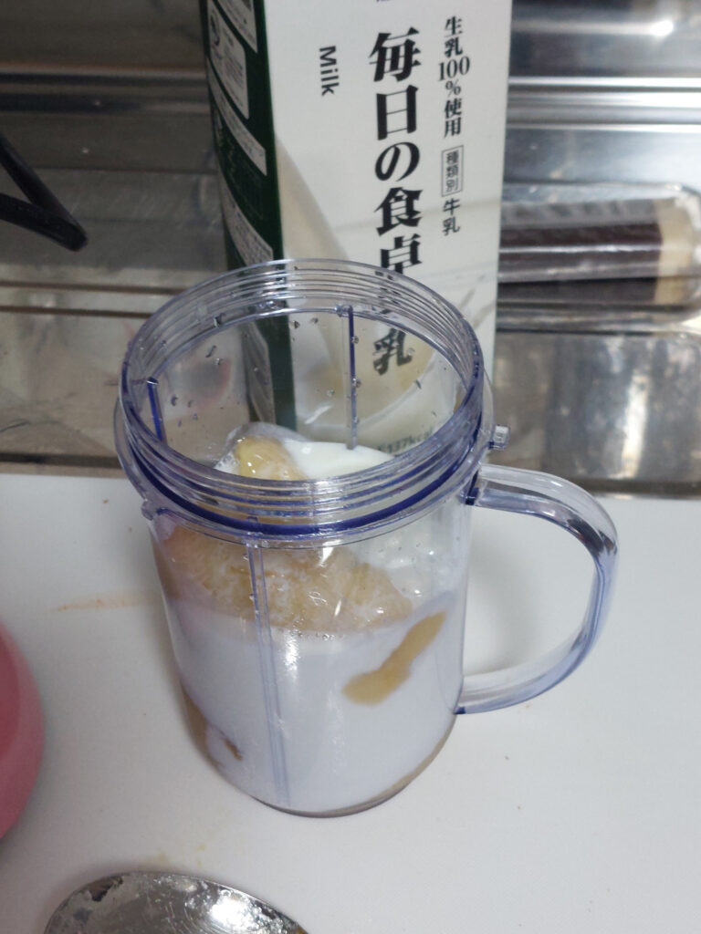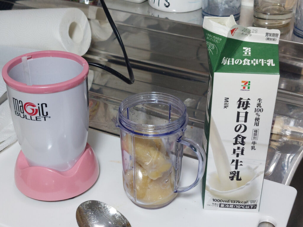 冷凍した、島バナナと牛乳を入れて、ブレードをねじ込んで・・・ほんの数秒、で出来上がり、牛乳と島バナナだけですが・・・えーーーー???こんなに???めちゃくちゃ甘ーーい!!!超ーーー美味い!!!お店できるんじゃない???ぐらいの出来でした・・・島バナナの濃厚な味もバッチリ!!!初めは、黒糖でも入れようかと思いましたが・・・全く必要ないです!!!島バナナを冷凍した事で更に甘さがアップしたのかな???冷凍保存した島バナナとマンゴーがまだ、一杯あるので、しばらく、フルーツスムージー???フルーツジュースを楽しめそうです、パチパチ!!!