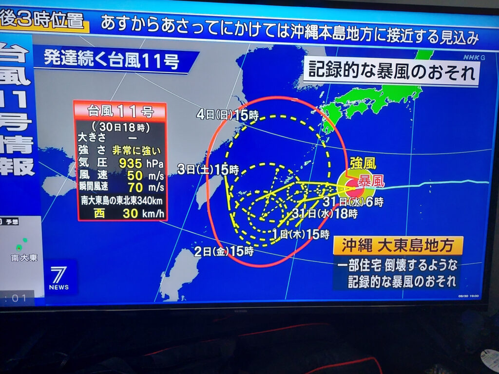 超ーーー!!!巨大な台風11号が到来です!!!沖縄に移住する時に一番心配だったのが台風です!!!北海道だと、台風も勢力がおさまったり、温帯低気圧に変わるので・・・中々、被害はありませんが・・・。北海道でも、大型の台風が来たときは、甚大な被害がありました・・・。自分が沖縄に来てからは、偶然、大型の台風のよる、直撃での被害は少なかったですが・・・。今回は「死に」やばいです!!!