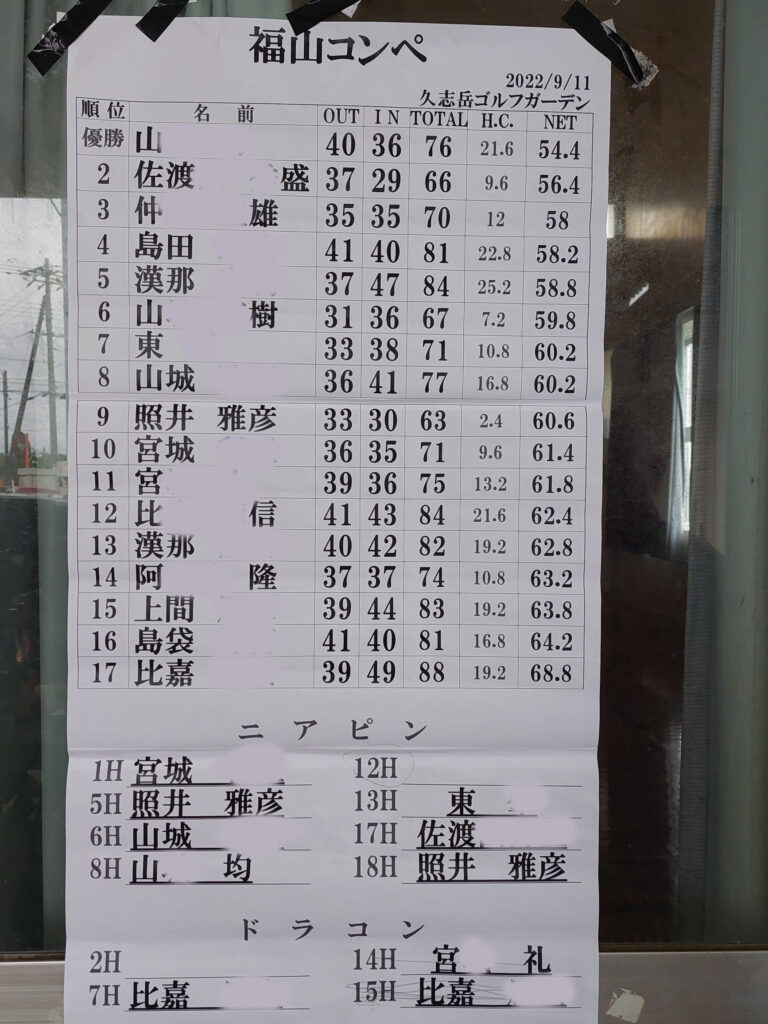 結局、バーディー1つ、パーが13個、ボギーが2つ、ダボ2つも・・・自分は持ってるので、ダボの2ヶ所とも、ぺリアに入らず、ベスグロもハンデ2.4で、残念ながら、9位でした。やはり、よーいドンで、1.5メートルのバーディーチャンスを外してから???が波に乗れませんでした・・・。1メートルちょっとから、3メートルぐらいの、バーディーチャンスは6.7回あったのに、入ったのは、一回だけでした。でも、久しぶりで、もアイアンはショットは良かったので大満足です!!!