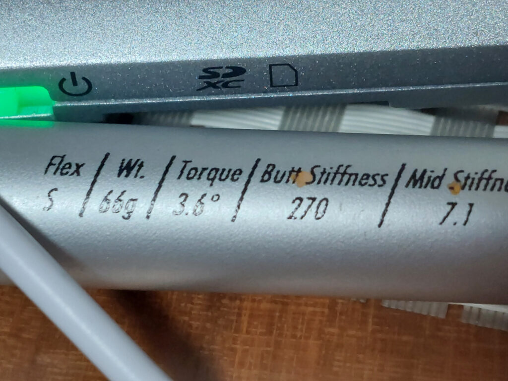 このシャフトには、シャフトに特性がプリントされていて、シャフト重量が66グラムで振動数は270と。実際に組みあがった、クラブを測ったら、振動数は272cpmでした。今から、10年以上前のシャフトなので、今ならXシャフトかSXシャフトの硬さです・・・