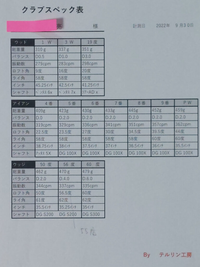 早速、13本のクラブの計測しました、ドライバーのシャフトはハードヒッター向けのベンタスTRの60X、ヘッドスピードは50以上だそうです、クラブ、シャフトのセッティングも中々でチョイスです。