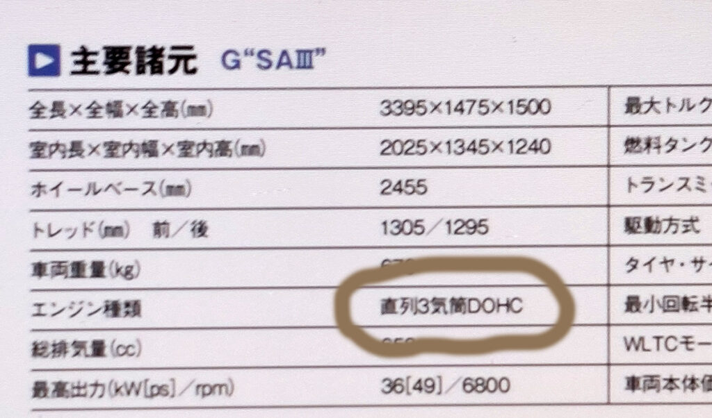 で・・・当然、エンジンもワングレードで、ノンターボですが・・・。なな???なんと???DOHC(ダブルオーバーヘッドカム)です!!!OHCでも、いんじゃねーーー???3気筒ですが・・・高回転型ということ???へーーー???なんか、昔の昭和の人間なんで・・・ちょっと嬉しいです!!!
