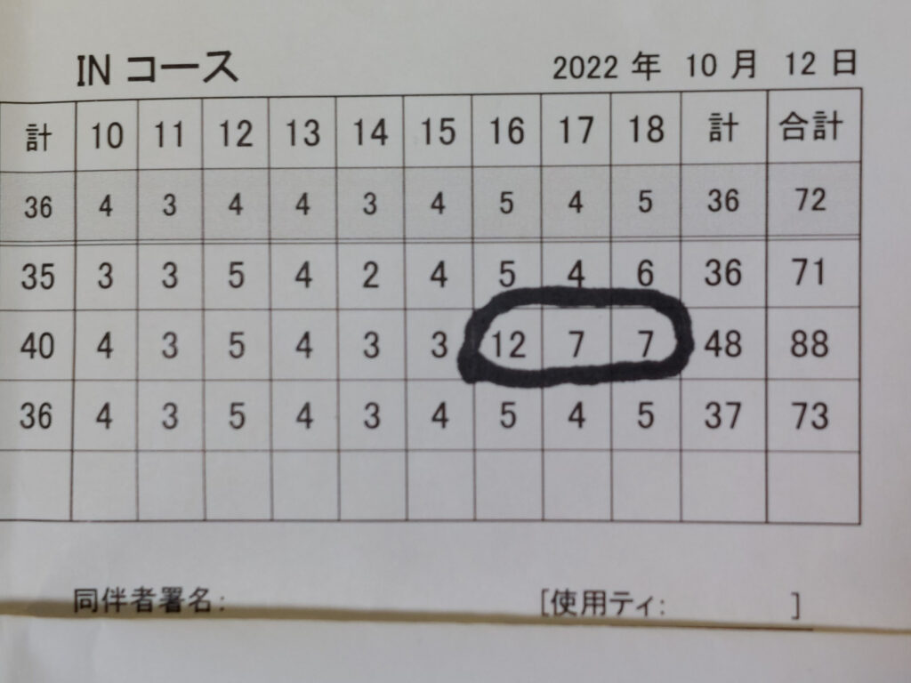 16番ロングで、ドライバーがフェアウェー真ん中のから、セカンドショット、好調だった3Wが左にOB、打ち直し、左にOB!!!3回目でやっと、ナイスショット、次が、残り、130ヤードシャンクでOB、結局11オン1パットで、そのホール12で1ホールで7オーバーで一瞬で70台も夢に・・・・