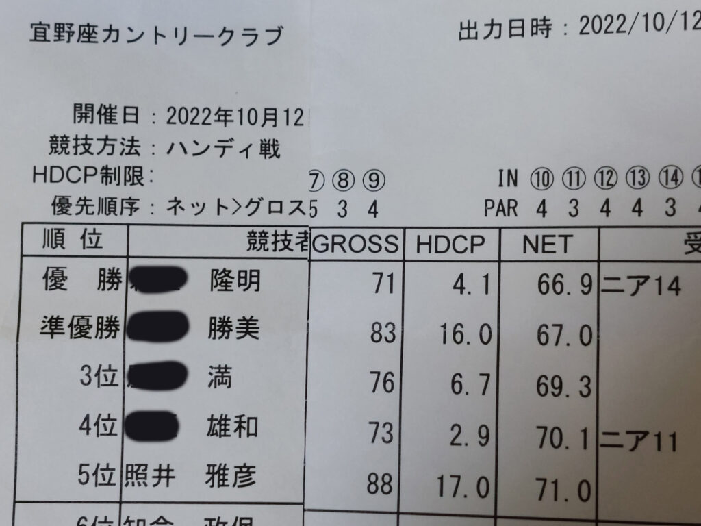 自分も、なんとか、前半4オーバーの40でしのぎ、後半は、10番から15番ホールまで、1バーディー1ボギーのパープレーで。二人のトップアマに次いで3位に入りました。「照井さん、この順位の画面撮ったら???」と言われる前に、同組で1.2.3位なんで、撮影してました。後3ホールを連続ボギーで3叩いてもでも・・・39で今シーズン初の70台&優勝がよぎった瞬間???
