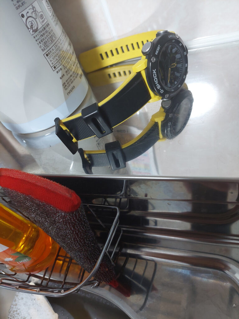 今日、これから、夜の仕事に行く前に、食事を作った、後に、流しで洗い物していると、え???そこに、置いてたの黄色い???Gショック・・・流しの奥の、黄色のスポンジに同化して気が付きませんでした・・・黄色いスポンジを使おうとすると、出てきましたラッキー???。