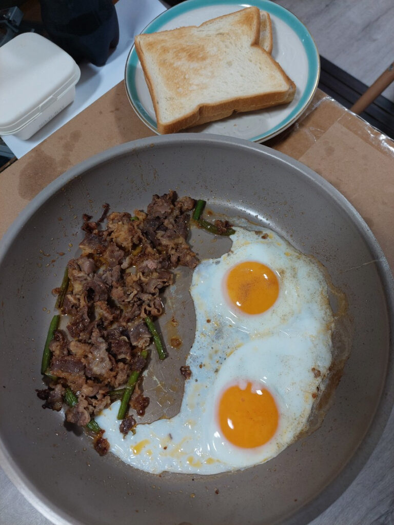 今日は、ブランチに焼肉バーガー風???トーストを作ってみました!!!パンを焼いて・・・、フライパンで牛肉とニンニクを焼いて・・・目玉焼きを二つ・・・でパンにのせて完成!!!