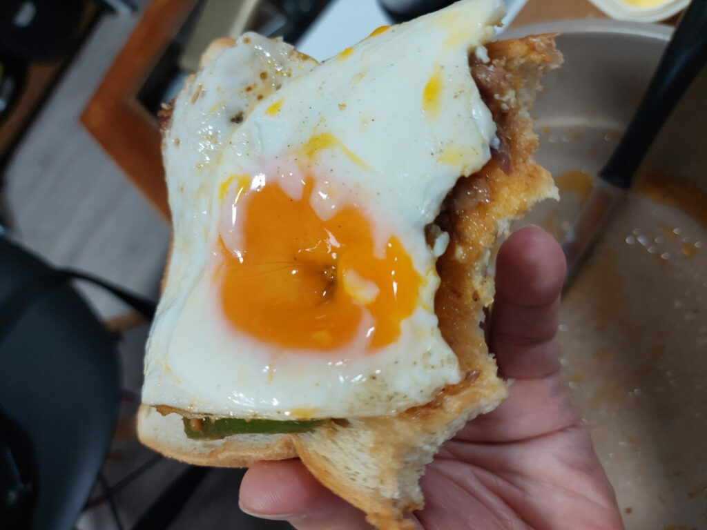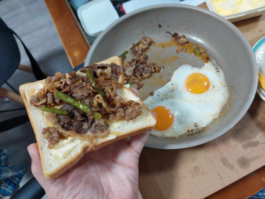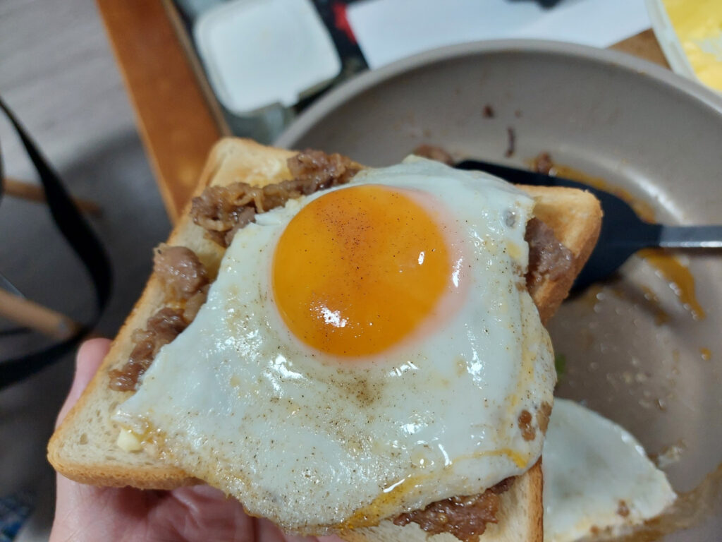 トーストした、パンにまず、焼肉をまんべなくのせて、その上に半熟目玉焼きをのせる・・・。食べるのが、ちょっと、コツがいて、そのままかぶりつくと、半熟、目玉焼きの黄身が爆発して、流れ出るので、箸なので、真ん中をツンツンして、黄身をパンになじませて食べました。これで、正解!!! 美味しーーーーい!!!パチパチ!!!