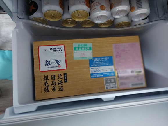 車をおろしてる間に、新巻き鮭の「銀聖」荷物を受け取って、冷蔵庫にとりあえず入れて、クルマの納車を終えてから、新巻き鮭の「銀聖」を、ビールを出して、冷蔵室に入れて???イヤイヤ!!!マイナス18度の冷凍庫でしょ!!!ちょうど、チョコアイスバーを完食したので。