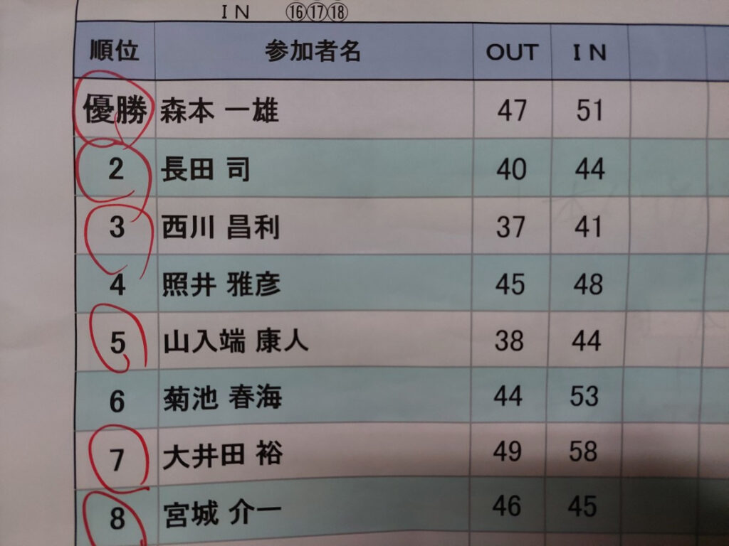 で・・・自分は、またまた 残念な順位の4位でした。3位も5位も賞金がありますが、4位は、何もありません。大井田くんが、7位でラッキー賞・ホールマッチ・ニアピン・別枠のニアピンも一人どりで稼いでその他にビンゴ大会も当たって稼ぎまくり???トーマスもビンゴ大会で当たってました!!!自分は、全然ダメダメでした・・・