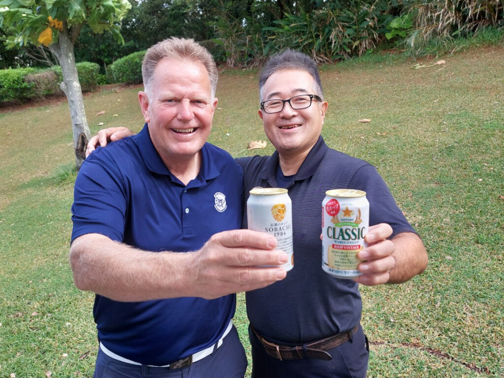 コースに着くと、雨はなく、曇りでしたが・・・スタートする時には、最高の天気になりました・・・スコアーの方は相変わらず大雨???でしたが・・・。限定のビールも持って行ってトーマスと大井田君に飲んでもらいながらラウンド。ゴルフ後名護の「タケちゃん為又店」で反省会です。