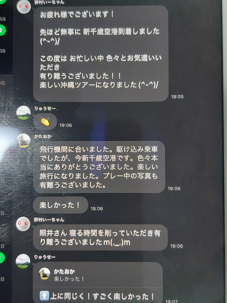 5日連続、朝からゴルフ、夜から朝まで夜勤の仕事ゴルフ後もテルリン工房の仕事が入った他タイヤ交換(また片べりで、内側がスリックタイヤでワイヤーが・・・危ない危ない!!!)、フォトブックを作ったり、睡眠は、仕事の休憩時間に、居眠りぐらい・・・。自分も何とか、色々アテンド出来て、片岡さん親子も、野村さんも沖縄のゴルフを良いも悪いも、満喫してもらって、良かったです!!!