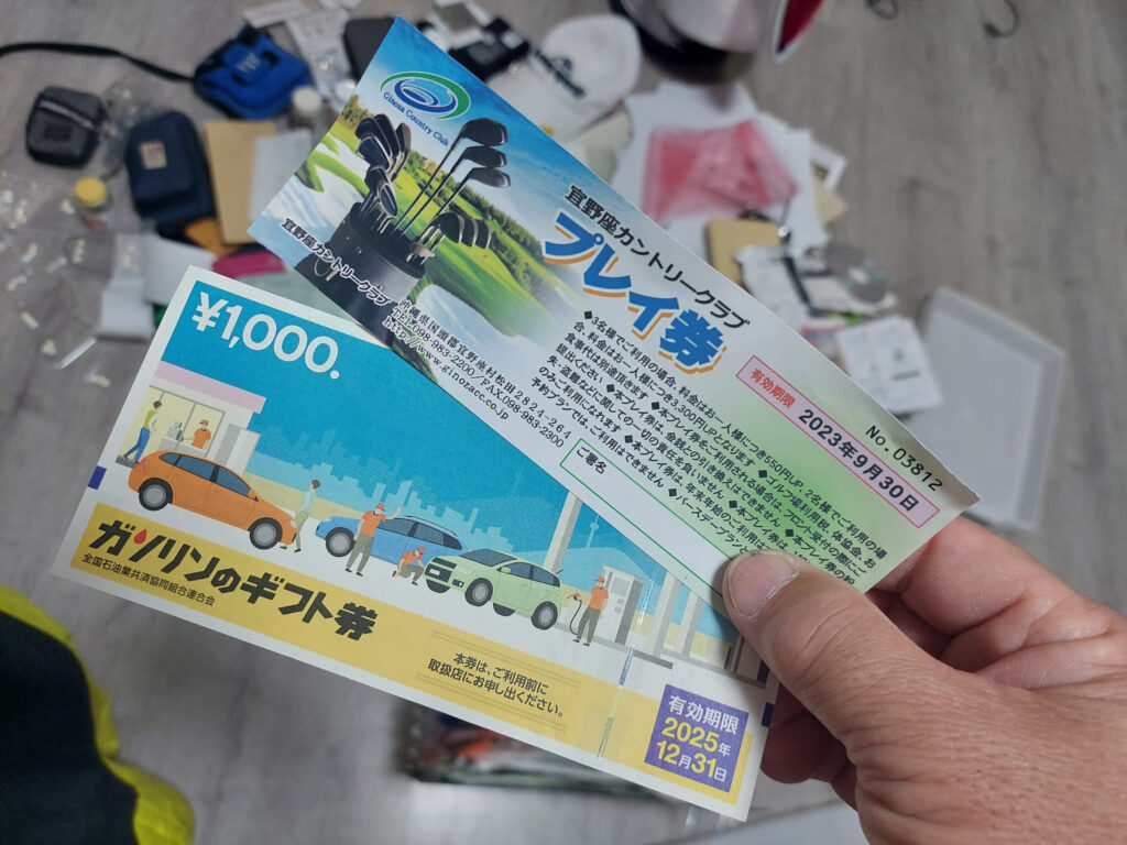 掃除をしてると、4本中2本が見つかって・・・3本に、まあ、これで、やっと2本弟にあげれる???充電器とともに・・・後は、忘れないで持って行って・・・忘れないで渡すだけが・・・デスクの、上にあった、領収書、色々な物が入った棚の中のモノも全部出して整理します・・・。今は一服中ですが・・・まあ、自分がダメダメなんですが!!!早速、見つけてラッキー???ものが2つありました・・・宜野座カントリーのプレー券とクルマのご成約記念のガソリン券無料券。