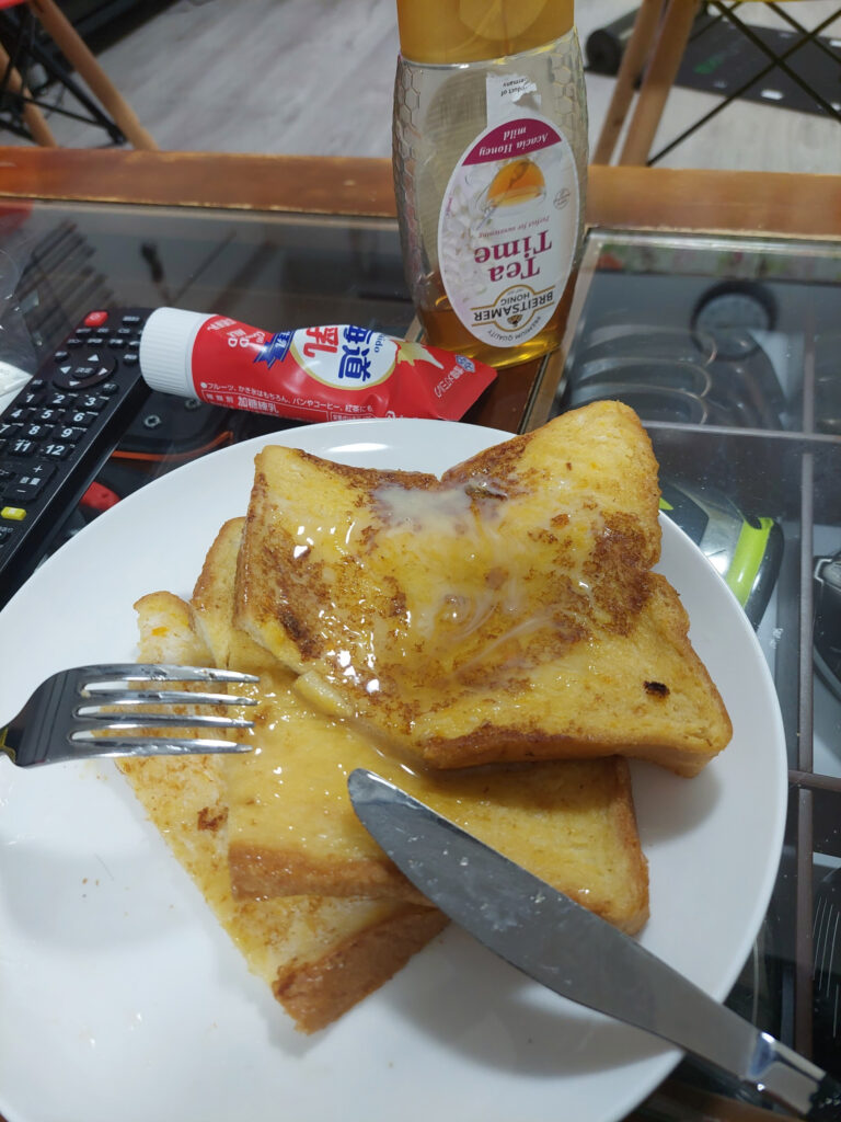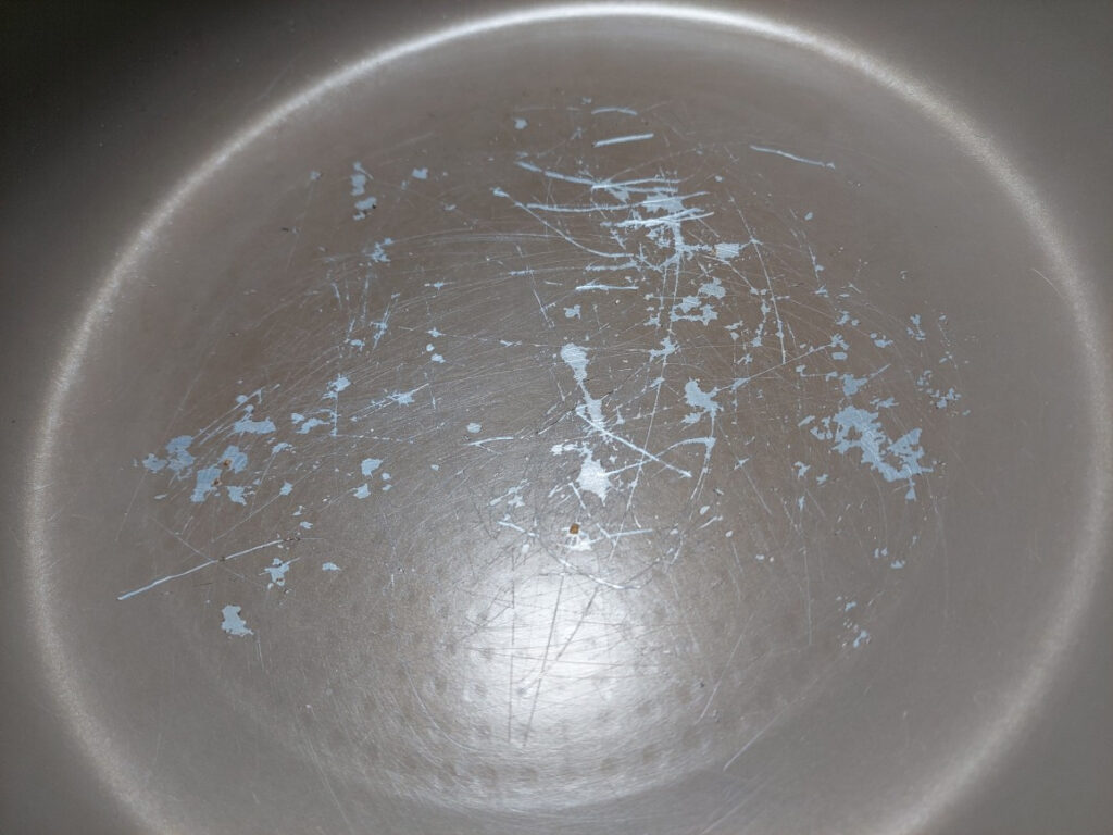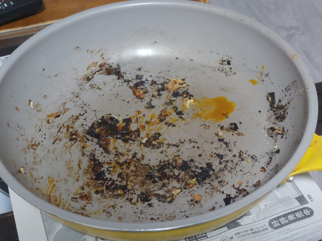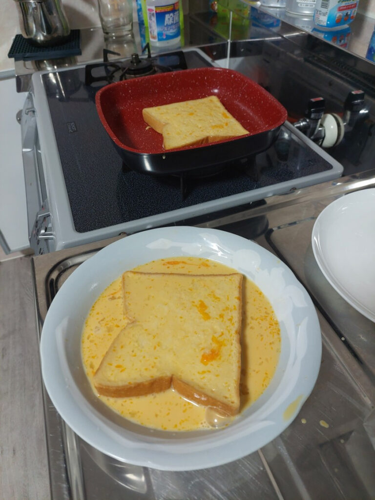 それが・・・数カ月前、小さなハゲが出来てから、ドンドン広がって、前は油をひかないで調理しても変な焦げ付きがなく、良かったのですが・・・それが・・・、焦げ付きが酷く、調理が終わった後の後片づけが、洗い物で、焦げを落とす作業だけでも大変です・・・。それでも、愛着があるので・・使ってましたが、今日は焦げつきやすい、フレンチトースト、香味チキン焼きだったのです。