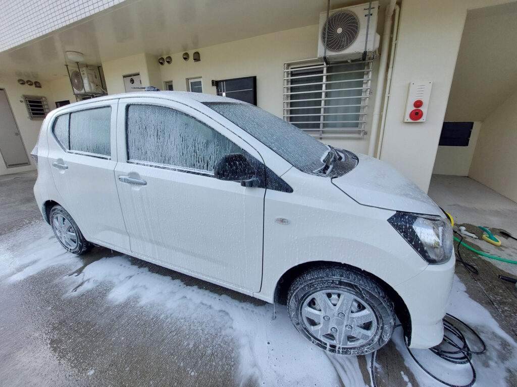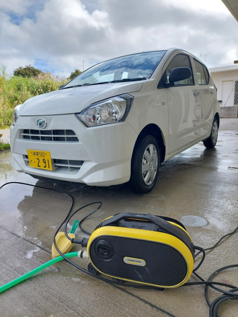 日差しが、あまり強くないので、自分で初洗車しました!!!買ってから、2000キロ、何回も???洗車しようと思うと、いつも雨で、やっと洗車しました自分で!!!前に、家の前で、ステーションワゴンを洗車した時は、日差しが強く汗だくでしたが・・・。今回は、涼しいのと、洗い方が何となくわかった???まず、ケルヒャーの高圧洗浄機で、満遍なく、水をかけて、でも、結構水垢が黒ずんでるので、落ちません・・・。で・・・濡れてから、ブラシで擦りながら、高圧洗浄機をかけて・・・。