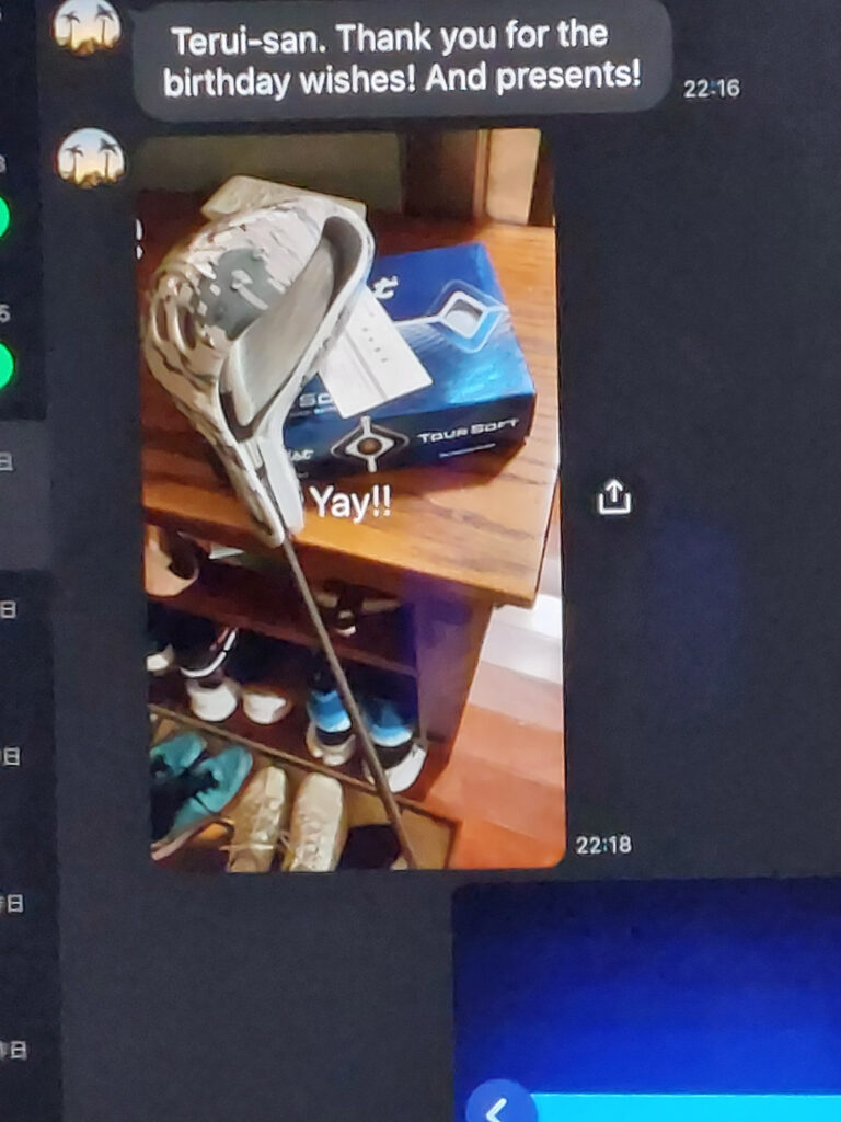PS.昨日は、ゴルフ友達でライバルのトーマスの61歳の誕生日!!!仕事前に、誕生日のプレゼントにドライバーのヘッドカバーとタイトリストのボールを1ダース持って行きました。ボールは自分より飛距離が出るので、OBが出やすいので、あっても困らないはずです!!!