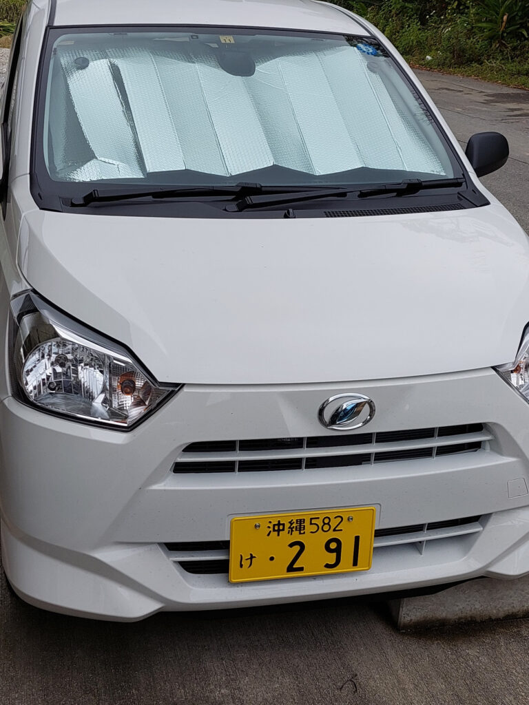 タピオカ黒糖紅茶ラージサイズをチュウチュウーしながら、名護のトンネルを通って帰るつもりが、途中にホームセンター「さくもと」があったので、寄って、ミライースのサンシェードを見る事に・・・。初めは4000円代も物があって、もっと安いの無いかな???左に行くと、ドンドン安くなって、2980円、1980円、980円・・・結局498円で消費税込みで547円でゲット出来ました。ただ、駐車中、強烈な直射日光を避けれればいいので・・・。