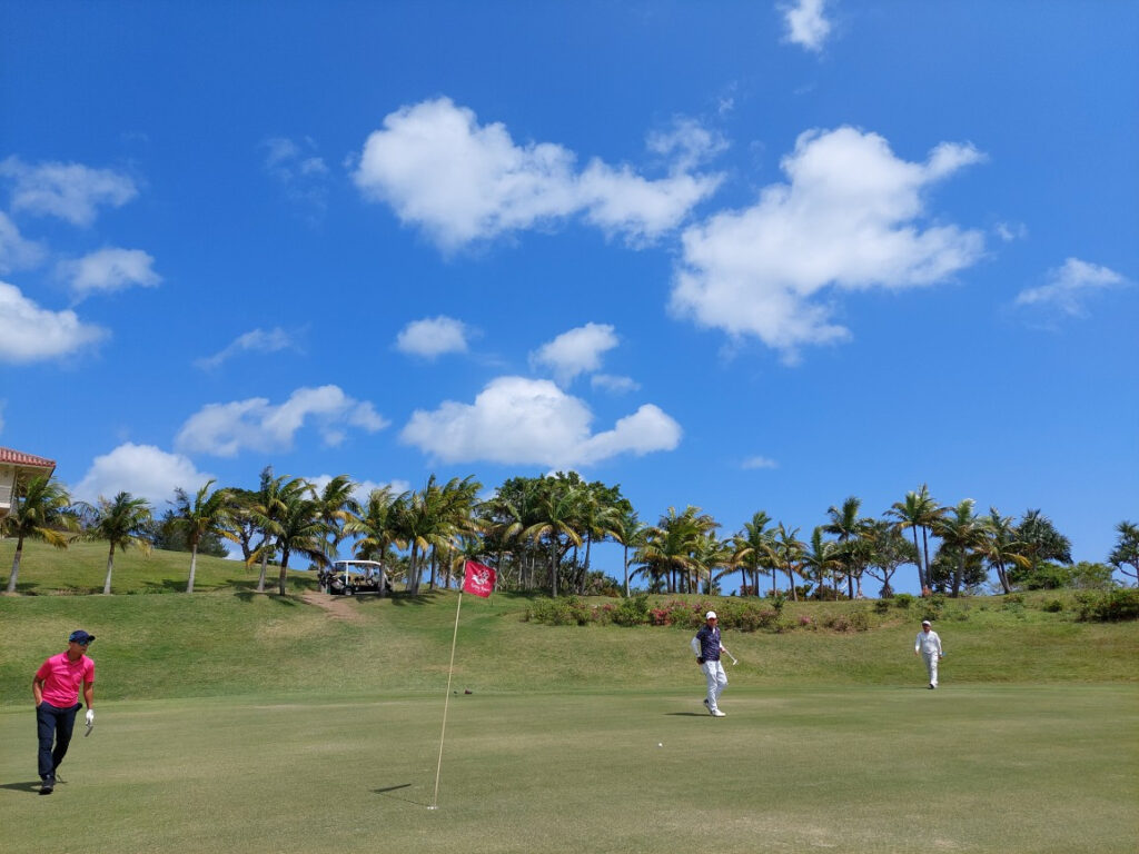 ちなみに、自分は一昨日に、腰を傷めて、ちょっと無理かな???と諦めてましたが、何か?いけそう?おっかなビックリスタート。アイアンが力を入れれず、全く縦の距離が合いません。シャンクこそ、出ませんでしたが、アプローチイップスの所が、トリ、ダボ、ダボ、ダボでした。グリーンも砂だらけで、遅すぎ・・・上からもビックリするくらい。一緒にラウンドしたメンバーの方が沖縄で一番重いグリーンと言うのも納得です。北海道帰ったら、また、この遅いグリーンから、早い?普通の速さに慣れるまで大変そうです!