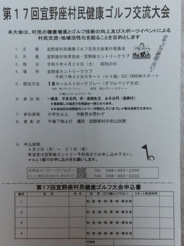 PS.家に帰ると、郵便ポストに、宜野座村からのお知らせが・・・。宜野座村民健康ゴルフ交流大会、去年は北海道に帰ってて出れなかったので、今年は出るぞーと思ったら???単独で、申し込めない!!!えーーー4人一組の申し込みです・・・宜野座村だけでゴルフ友達は80人以上居ますが・・・。んーーー!皆、誰かと決まってそうだし。