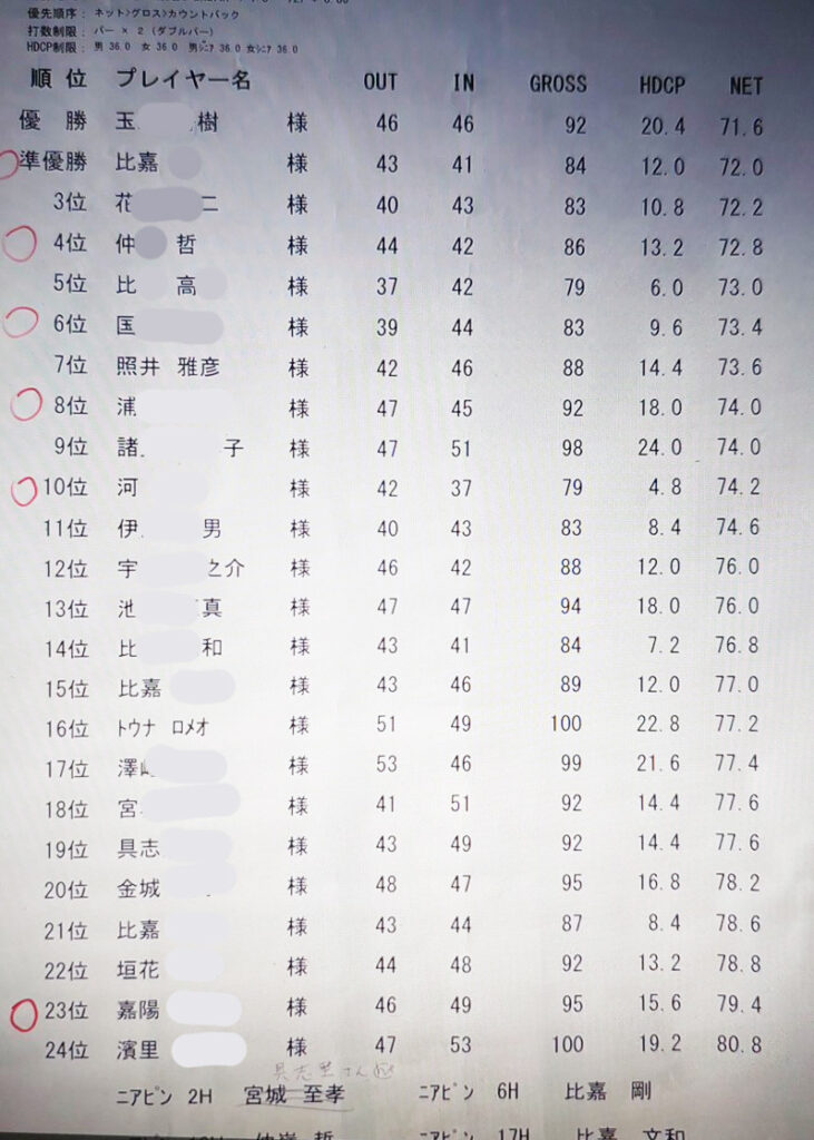 カヌチャはイン方が簡単なのですが、前半はアイアンが不調に3パットが多くて46。後半はパースタート2番ショートは8メーターに付けるも、重くて3パットボギー。3番でバーディー、4番のロングで、3打目を1メートルのバーディーを外して、5番でドライバー真ん中もウッドでチョロ、シャンクの距離が残ってまんまと、アプローチイップスでて、ダボ。8番で10メートルから、3打かかって、ボギー。最終ホールもダボで42で、88で何とか90切りでした。
