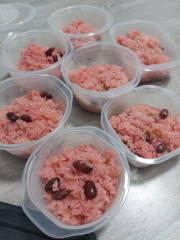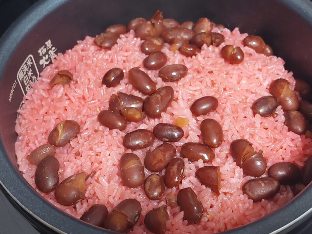 PS.買った、もち米を全て、使い切りました!一回目でソコソコの出来ばえだった、北海道と沖縄の融合赤飯、3回目でなので、完成の域に達してます。1回目は普段ぜんざいでお餅を焼いて入れるので、オキハムの麦入りぜんざいを使いましたが、麦が見栄え悪いので、ぜんざいのみに・・・食紅の色も、炊きあがって、良い感じの色に仕上がってます。パチパチ!
